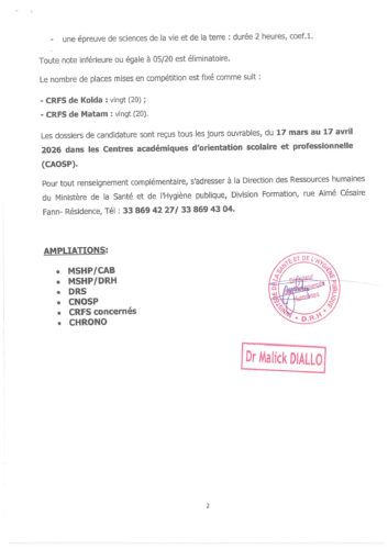 Pour toute information complémentaire, les candidats peuvent s’adresser à la Direction des Ressources humaines du Ministère de la Santé et de l’Hygiène publique, Division Formation, située rue Aimé Césaire à Fann Résidence.