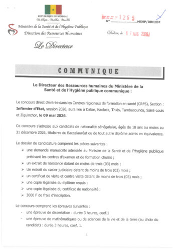 Le Ministère de la Santé et de l’Hygiène publique du Sénégal a annoncé l’ouverture du concours direct d’entrée dans les Centres régionaux de formation en santé (CRFS), section Infirmier d’État, au titre de la session 2026. Ce concours vise à former de nouveaux professionnels de santé pour répondre aux besoins du système sanitaire national.