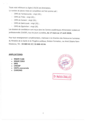 Pour toute information supplémentaire, les candidats peuvent contacter la Direction des Ressources humaines du Ministère de la Santé et de l’Hygiène publique, Division Formation, située rue Aimé Césaire à Fann Résidence.