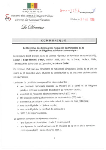 Le Ministère de la Santé et de l’Hygiène publique du Sénégal a officiellement lancé le concours direct d’entrée dans les Centres régionaux de formation en santé (CRFS), section Sage-femme d’État, pour la session 2026. Ce recrutement vise à renforcer les effectifs du personnel de santé à travers plusieurs régions du pays.