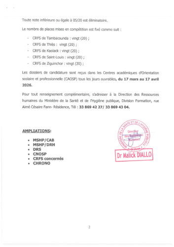 Pour toute information supplémentaire, les candidates peuvent s’adresser à la Direction des Ressources humaines du Ministère de la Santé et de l’Hygiène publique, Division Formation, située rue Aimé Césaire à Fann Résidence.